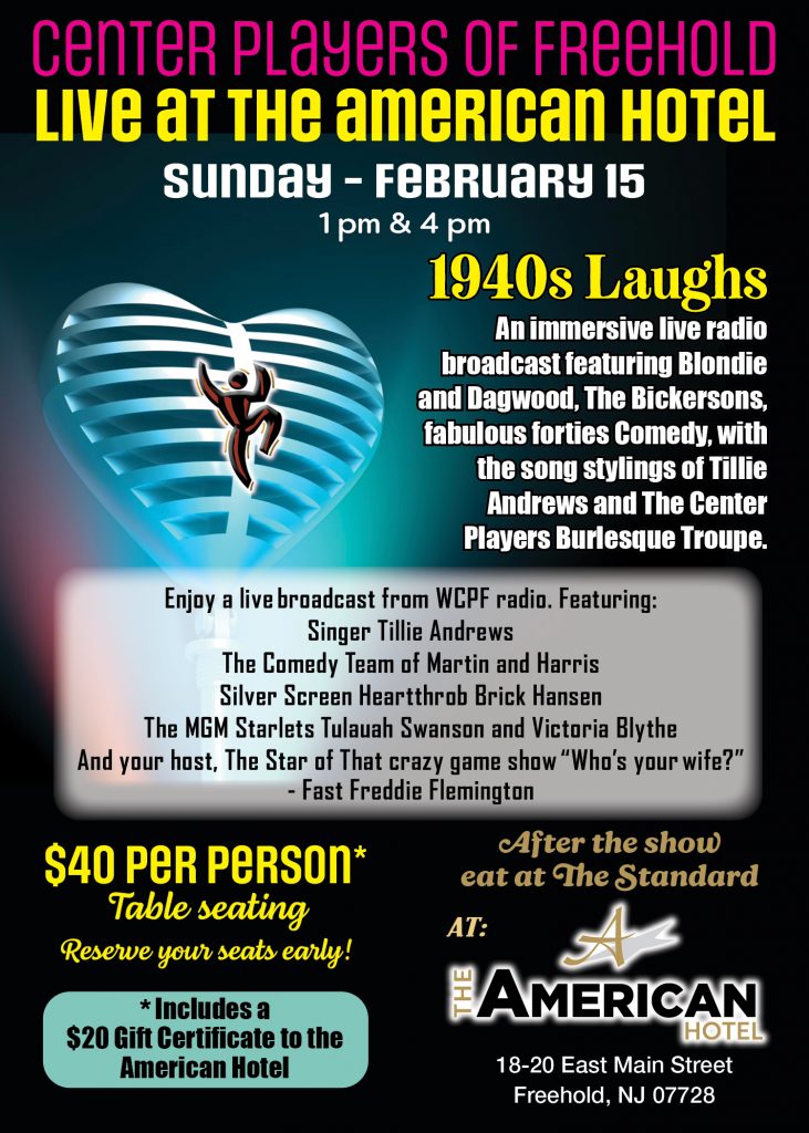 Upcoming MONDAY NITE PLAY READINGSat theAmerican Hotel, FreeholdJANUARY 12, 2026 12 ANGRY MEN by Reginald RoseFEBRUARY 2, 2026 BETRAYAL by Harold PinterMARCH 2, 2026 THE DRESSER by Ronald HarwoodReadings begin promptly at 7pm.TO LEARN MORE CLICK HEREORDER YOUR SEATS EARLY - THERE IS LIMITIED SEATING